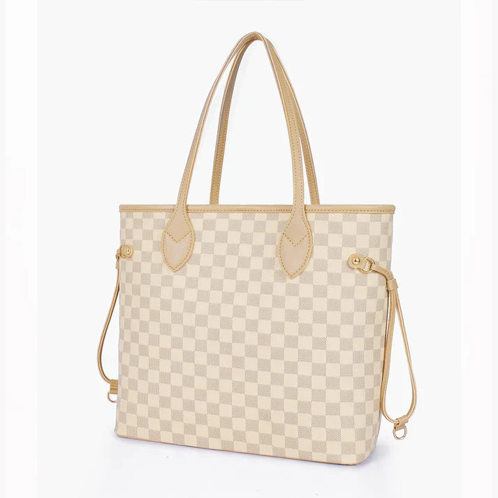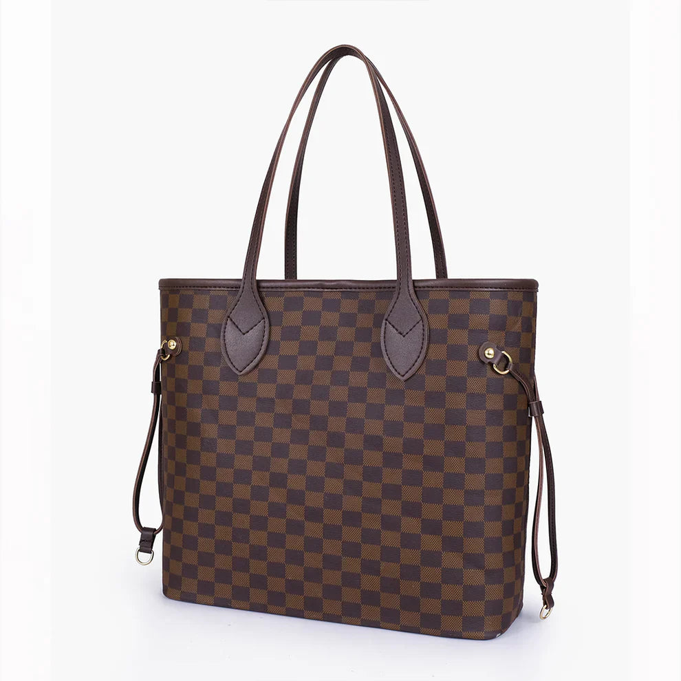 Width (top): 17.5 inches Width (bottom): 12.5 inches Height: 12 inches Depth: 5 inches One main compartment with hook closure One inside zipper pocket Material: Faux leather.
